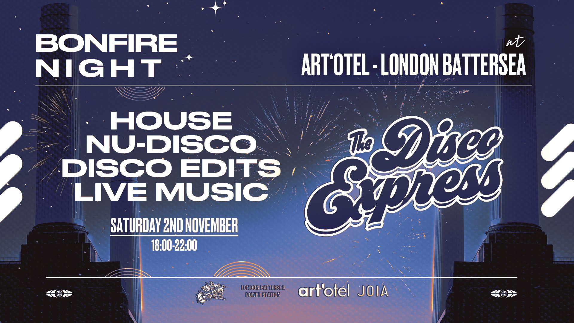 Joia RooftopFor 1 night only on Saturday 2nd November, the JOIA Rooftop is opening back up (after closing for winter) to celebrate Bonfire Night in Battersea with Disco Express!